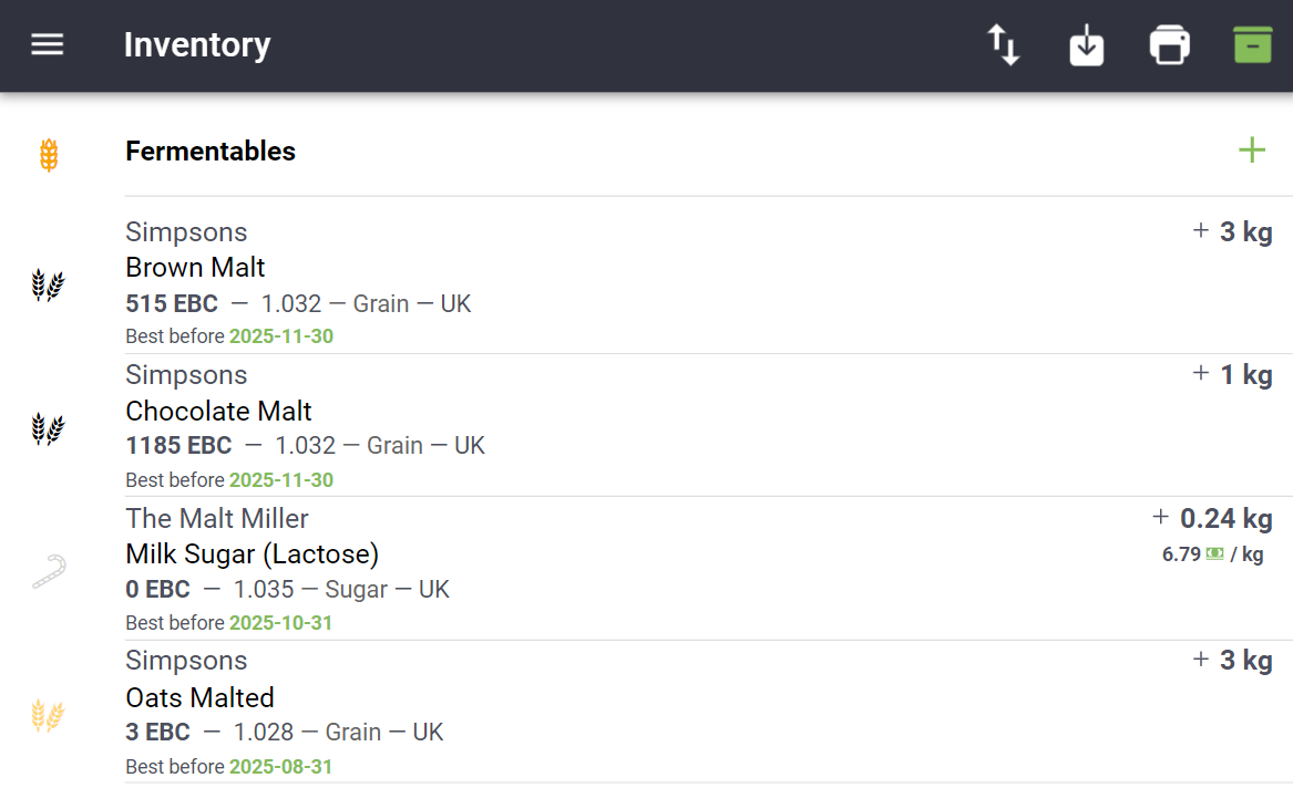 You can print a full list of the ingredients in stock, this is particularly useful for stock inventory/audit processes in a commercial brewery. Printing requires a **Premium** subscription. Just click the Print <img src="https://771697612-files.gitbook.io/~/files/v0/b/gitbook-x-prod.appspot.com/o/spaces%2F-LEzhWP2LGeXaKgS2qr4-887967055%2Fuploads%2FPZyzuYH7jIXPoNILpTr5%2Fprint_button.png?alt=media&#x26;token=2fae5598-c4a7-4438-b778-0d5fc5aafdf2" alt="" data-size="line"> button and check the boxes from the options below of items to include in the printout. Fermentables, Hops, Misc and Yeast are checked by default.